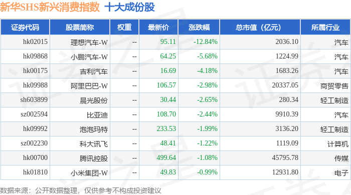 新华SHS新兴消费(989006)指数十大成份股详情如下: