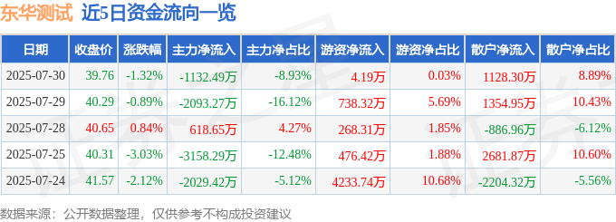 证券之星消息,截至2025年7月30日收盘,东华测试(300354)报收于39.76元,下跌1.32%,换手率3.92%,成交量3.18万手,成交额1.27亿元。
