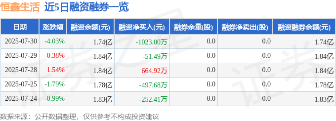 恒鑫生活融资融券信息显示,融资方面,当日融资买入2402.31万元,融资偿还3425.3万元,融资净偿还1023.0万元。融券方面,融券卖出0.0股,融券偿还0.0股,融券余量0.0股,融券余额0.0万元。融资融券余额1.74亿元。