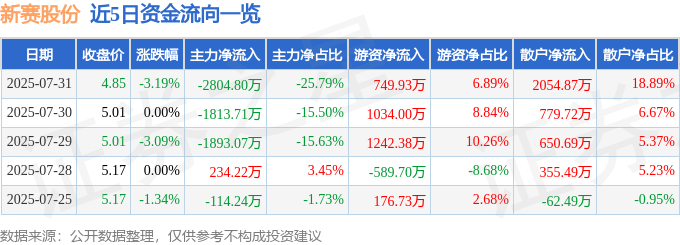 证券之星消息,截至2025年7月31日收盘,新赛股份(600540)报收于4.85元,下跌3.19%,换手率3.82%,成交量22.18万手,成交额1.09亿元。