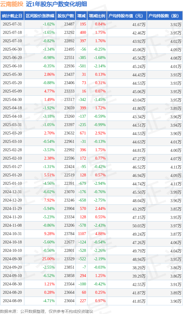 从股价来看,2025年7月18日至2025年7月31日,云南能投区间跌幅为1.02%,在此期间股东户数增加195.0户,增幅为0.84%。