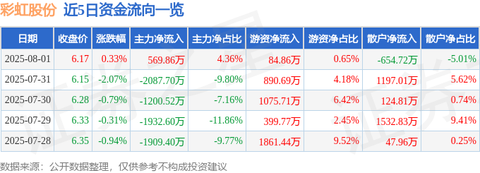 证券之星消息,截至2025年8月1日收盘,彩虹股份(600707)报收于6.17元,上涨0.33%,换手率0.59%,成交量21.15万手,成交额1.31亿元。