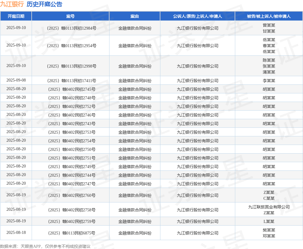案号:(2025)赣0828民初1333号根据统计,近一年内以九江银行股份有限公司为当事人的历史开庭公告有853则,其中案由为“金融借款合同纠纷”的公告以829则居首,其次为“被继承人债务清偿纠纷”有5则,“借款合同纠纷”有4则。历史开庭公告(前20条)如下:
