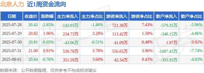 资金流向数据方面,本周北京人力主力资金合计净流入932.01万元,游资资金合计净流入1474.89万元,散户资金合计净流出2406.9万元。本周资金流向一览见下表: