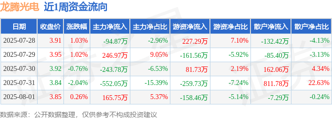 资金流向数据方面,本周龙腾光电主力资金合计净流出477.98万元,游资资金合计净流出270.74万元,散户资金合计净流入748.72万元。本周资金流向一览见下表: