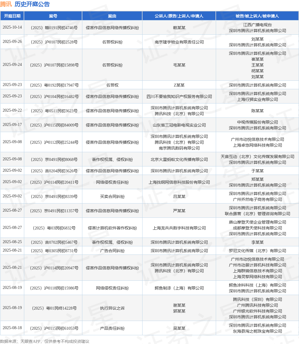 案号:(2024)浙01民初2859号根据统计,近一年内以深圳市腾讯计算机系统有限公司为当事人的历史开庭公告有1405则,其中案由为“侵害作品信息网络传播权纠纷”的公告以456则居首,其次为“著作权权属、侵权纠纷”有134则,“网络服务合同纠纷”有128则。历史开庭公告(前20条)如下: