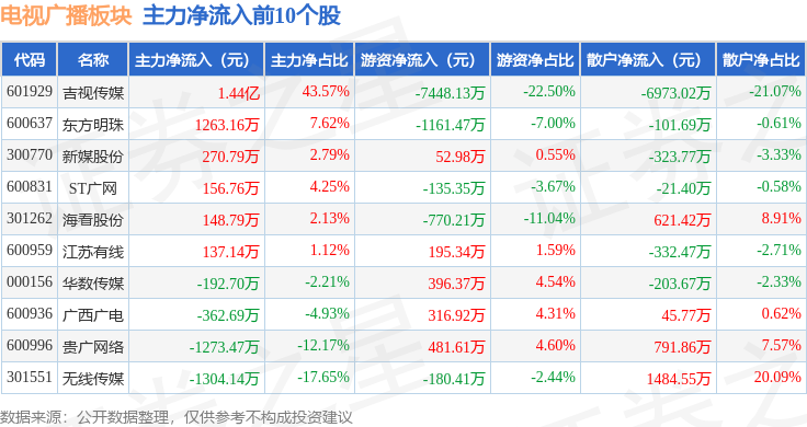 从资金流向上来看,当日电视广播板块主力资金净流入6766.95万元,游资资金净流出8191.74万元,散户资金净流入1424.79万元。电视广播板块个股资金流向见下表: