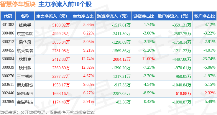 从资金流向上来看,当日智慧停车板块主力资金净流出5156.31万元,游资资金净流出1.72亿元,散户资金净流入2.23亿元。智慧停车板块个股资金流向见下表:
