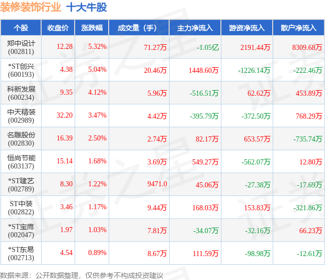 个股表现方面,装修装饰行业当日领涨股为郑中设计(002811),该股当日报收12.28,上涨5.32%,成交量71.27万,主力资金净流出1.05亿元。*ST创兴(600193)以上涨5.04%紧随其后,该股当日成交量20.46万,主力资金净流入1448.6万元。除此之外,科新发展(600234)、中天精装(002989)、名雕股份(002830)均进入当日牛股之列。具体个股列表见下表: