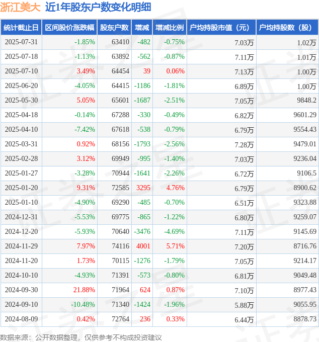 从股价来看,2025年7月18日至2025年7月31日,浙江美大区间跌幅为1.85%,在此期间股东户数减少482.0户,减幅为0.75%。
