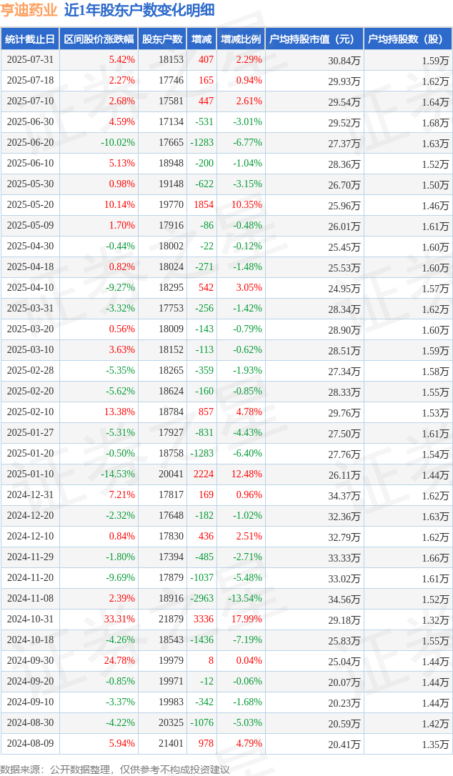 从股价来看,2025年7月18日至2025年7月31日,亨迪药业区间涨幅为5.42%,在此期间股东户数增加407.0户,增幅为2.29%。