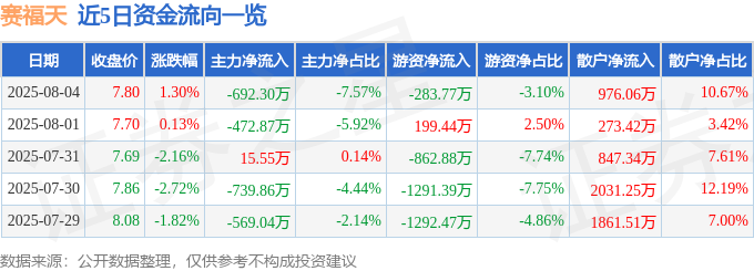 证券之星消息,截至2025年8月4日收盘,赛福天(603028)报收于7.8元,上涨1.3%,换手率4.13%,成交量11.86万手,成交额9150.31万元。