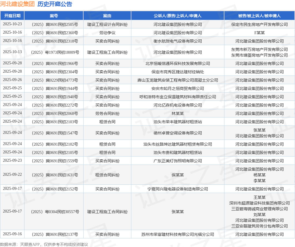 案号:(2025)冀0691民初1884号根据统计,近一年内以河北建设集团股份有限公司为当事人的历史开庭公告有1494则,其中案由为“买卖合同纠纷”的公告以553则居首,其次为“建设工程施工合同纠纷”有224则,“劳务合同纠纷”有130则。历史开庭公告(前20条)如下: