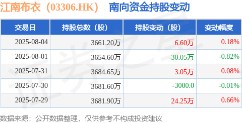 证券之星消息,8月4日南向资金增持6.6万股江南布衣(03306.HK)。近5个交易日中,获南向资金增持的有3天,累计净增持3.55万股。近20个交易日中,获南向资金减持的有12天,累计净减持72.0万股。截至目前,南向资金持有江南布衣(03306.HK)3661.2万股,占公司已发行普通股的7.05%。