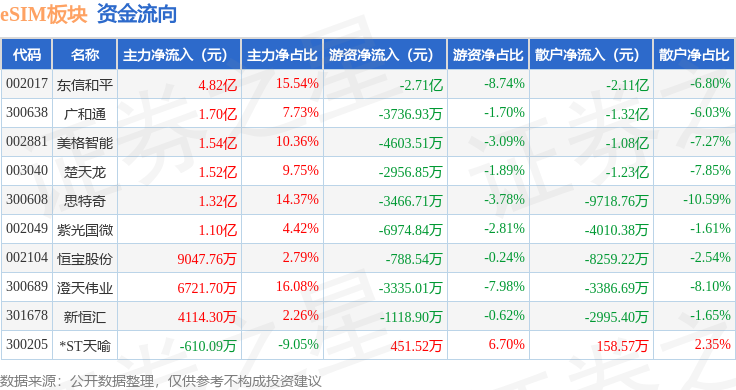 从资金流向上来看,当日eSIM板块主力资金净流入13.93亿元,游资资金净流出5.36亿元,散户资金净流出8.56亿元。eSIM板块个股资金流向见下表: