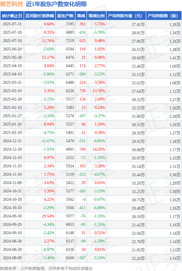 从股价来看,2025年7月18日至2025年7月31日,雅艺科技区间涨幅为0.6%,在此期间股东户数增加392.0户,增幅为5.76%。