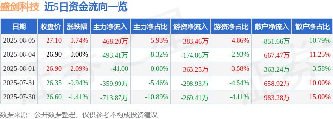 近5日资金流向一览见下表: