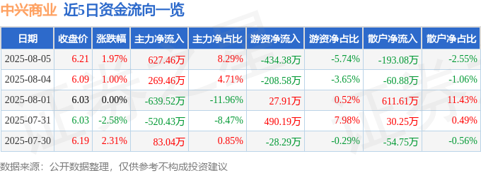 证券之星消息,截至2025年8月5日收盘,中兴商业(000715)报收于6.21元,上涨1.97%,换手率2.27%,成交量12.23万手,成交额7564.73万元。