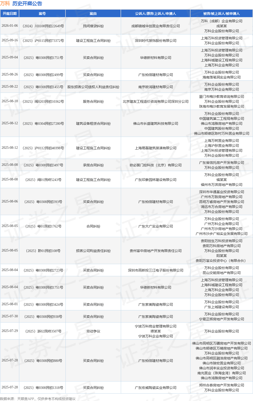 案号:(2025)闽01民终5243号根据统计,近一年内以万科企业股份有限公司为当事人的历史开庭公告有343则,其中案由为“买卖合同纠纷”的公告以205则居首,其次为“建设工程施工合同纠纷”有27则,“服务合同纠纷”有15则。历史开庭公告(前20条)如下: