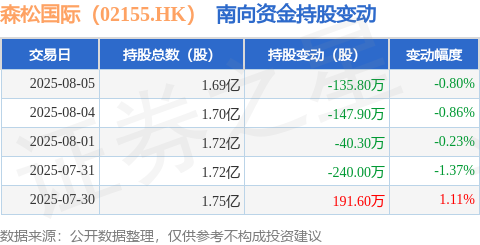 证券之星消息,8月5日南向资金减持135.8万股森松国际(02155.HK)。近5个交易日中,获南向资金减持的有4天,累计净减持372.4万股。近20个交易日中,获南向资金减持的有13天,累计净减持707.1万股。截至目前,南向资金持有森松国际(02155.HK)1.69亿股,占公司已发行普通股的13.56%。