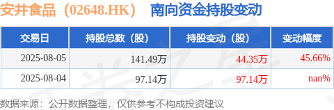 证券之星消息,8月5日南向资金增持44.35万股安井食品(02648.HK)。截至目前,南向资金持有安井食品(02648.HK)141.49万股,占公司已发行普通股的3.53%。