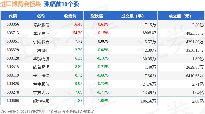 证券之星消息,8月6日进口博览会板块较上一交易日下跌0.69%,畅联股份领跌。当日上证指数报收于3633.99,上涨0.45%。深证成指报收于11177.78,上涨0.64%。进口博览会板块个股涨跌见下表: