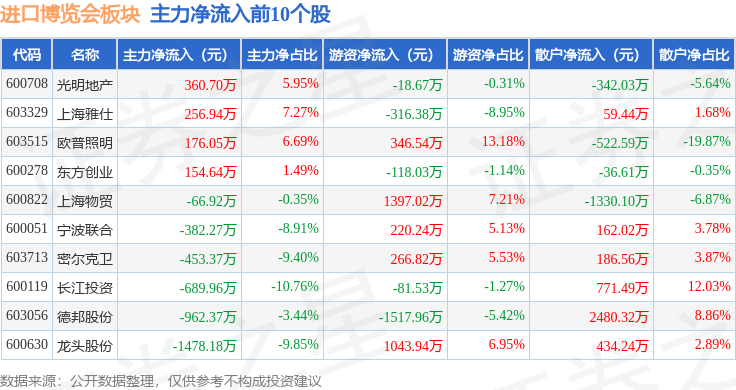 从资金流向上来看,当日进口博览会板块主力资金净流出1.26亿元,游资资金净流入1478.19万元,散户资金净流入1.11亿元。进口博览会板块个股资金流向见下表: