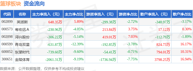 从资金流向上来看,当日篮球板块主力资金净流出3321.61万元,游资资金净流出1650.74万元,散户资金净流入4972.35万元。篮球板块个股资金流向见下表: