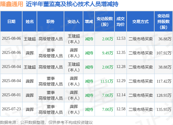 隆鑫通用近半年内的董监高及核心技术人员增减持详情如下: