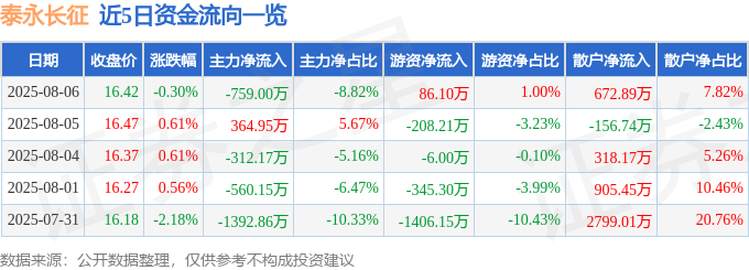 证券之星消息,截至2025年8月6日收盘,泰永长征(002927)报收于16.42元,下跌0.3%,换手率2.37%,成交量5.23万手,成交额8604.75万元。