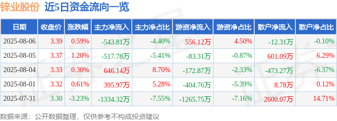 证券之星消息,截至2025年8月6日收盘,锌业股份(000751)报收于3.39元,上涨0.59%,换手率2.58%,成交量36.39万手,成交额1.24亿元。