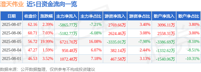 证券之星消息,截至2025年8月7日收盘,澄天伟业(300689)报收于62.16元,上涨2.39%,换手率13.34%,成交量13.49万手,成交额8.14亿元。