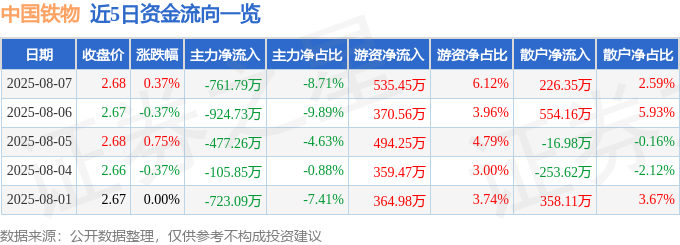 证券之星消息,截至2025年8月7日收盘,中国铁物(000927)报收于2.68元,上涨0.37%,换手率0.54%,成交量32.73万手,成交额8745.43万元。