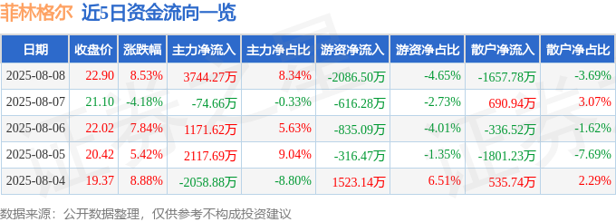 证券之星消息,截至2025年8月8日收盘,菲林格尔(603226)报收于22.9元,上涨8.53%,换手率5.56%,成交量19.75万手,成交额4.49亿元。