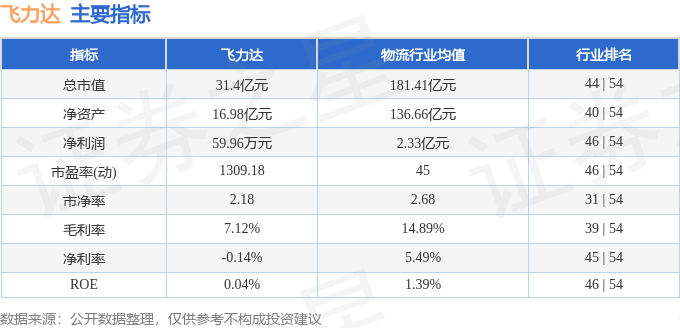 飞力达2025年一季报显示,公司主营收入14.31亿元,同比下降7.11%;归母净利润59.96万元,同比上升120.55%;扣非净利润-14.52万元,同比上升97.44%;负债率56.81%,投资收益-48.19万元,财务费用1157.0万元,毛利率7.12%。飞力达(300240)主营业务:智能制造企业提供供应链管理服务,分为综合物流服务和国际货运代理物流服务两部分。