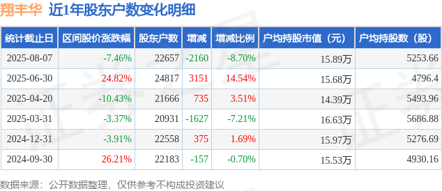 从股价来看,2025年6月30日至2025年8月7日,翔丰华区间跌幅为7.46%,在此期间股东户数减少2160.0户,减幅为8.7%。
