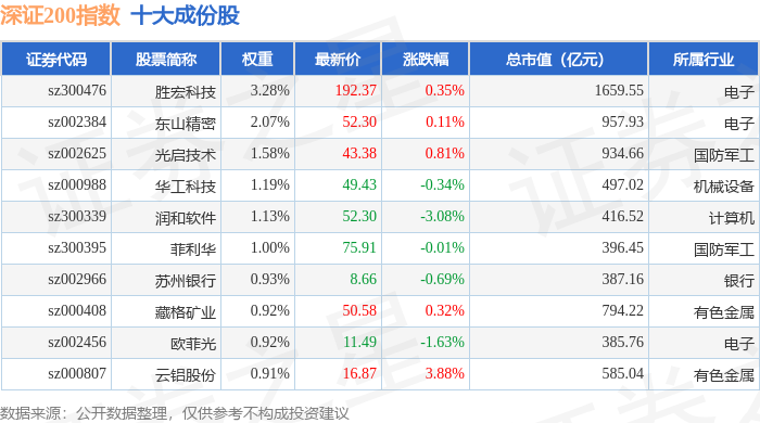 深证200(399009)指数十大成份股详情如下: