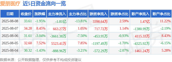 证券之星消息,截至2025年8月8日收盘,爱朋医疗(300753)报收于33.61元,下跌1.95%,换手率43.6%,成交量35.94万手,成交额13.12亿元。