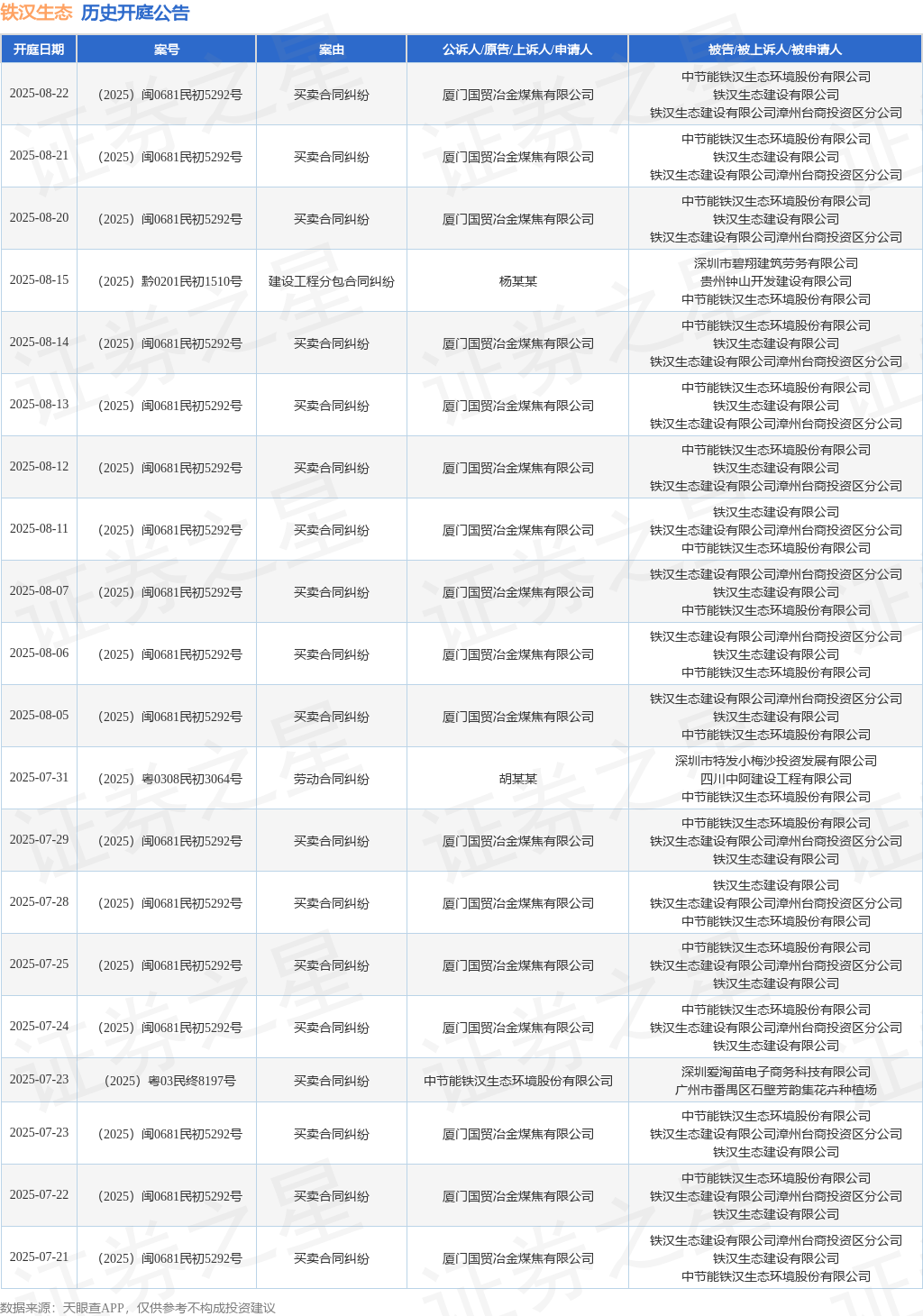 案号:(2025)闽0681民初5292号根据统计,近一年内以中节能铁汉生态环境股份有限公司为当事人的历史开庭公告有71则,其中案由为“买卖合同纠纷”的公告以28则居首,其次为“建设工程分包合同纠纷”有13则,“建设工程施工合同纠纷”有10则。历史开庭公告(前20条)如下:
