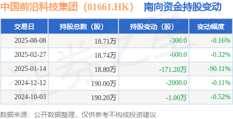 证券之星消息,8月8日南向资金减持300.0股中国前沿科技集团(01661.HK)。近5个交易日中,获南向资金减持的有5天,累计净减持172.49万股。近20个交易日中,获南向资金减持的有20天,累计净减持1.68亿股。截至目前,南向资金持有中国前沿科技集团(01661.HK)18.71万股,占公司已发行普通股的0.09%。