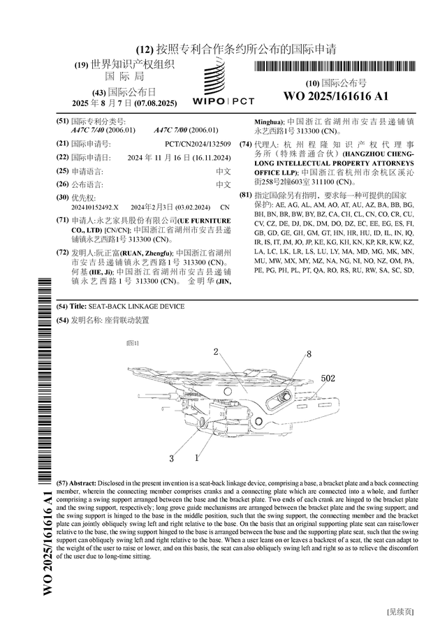 证券之星消息,根据企查查数据显示永艺股份(603600)公布了一项国际专利申请,专利名为“座背联动装置”,专利申请号为PCT/CN2024/132509,国际公布日为2025年8月7日。