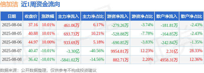 资金流向数据方面,本周倍加洁主力资金合计净流出3.68亿元,游资资金合计净流入9338.52万元,散户资金合计净流入2.74亿元。本周资金流向一览见下表: