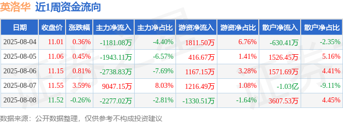 资金流向数据方面,本周英洛华主力资金合计净流入907.1万元,游资资金合计净流入3281.29万元,散户资金合计净流出4188.39万元。本周资金流向一览见下表: