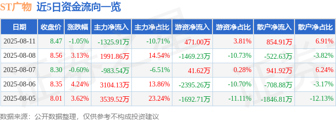 证券之星消息,截至2025年8月11日收盘,ST广物(600603)报收于8.47元,下跌1.05%,换手率1.21%,成交量14.43万手,成交额1.24亿元。