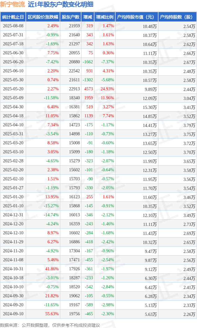 从股价来看,2025年7月31日至2025年8月8日,新宁物流区间涨幅为2.49%,在此期间股东户数增加319.0户,增幅为1.47%。