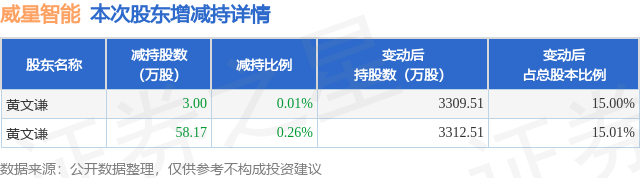 证券之星消息,8月11日威星智能发布公告《威星智能:简式权益变动报告书》,其股东黄文谦于2025年8月7日至2025年8月11日间合计减持61.17万股,占公司目前总股本的0.2772%,变动期间该股股价上涨1.59%,截止8月11日收盘报16.01元。