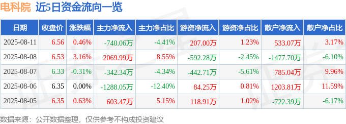 证券之星消息,截至2025年8月11日收盘,电科院(300215)报收于6.56元,上涨0.46%,换手率4.59%,成交量25.82万手,成交额1.68亿元。