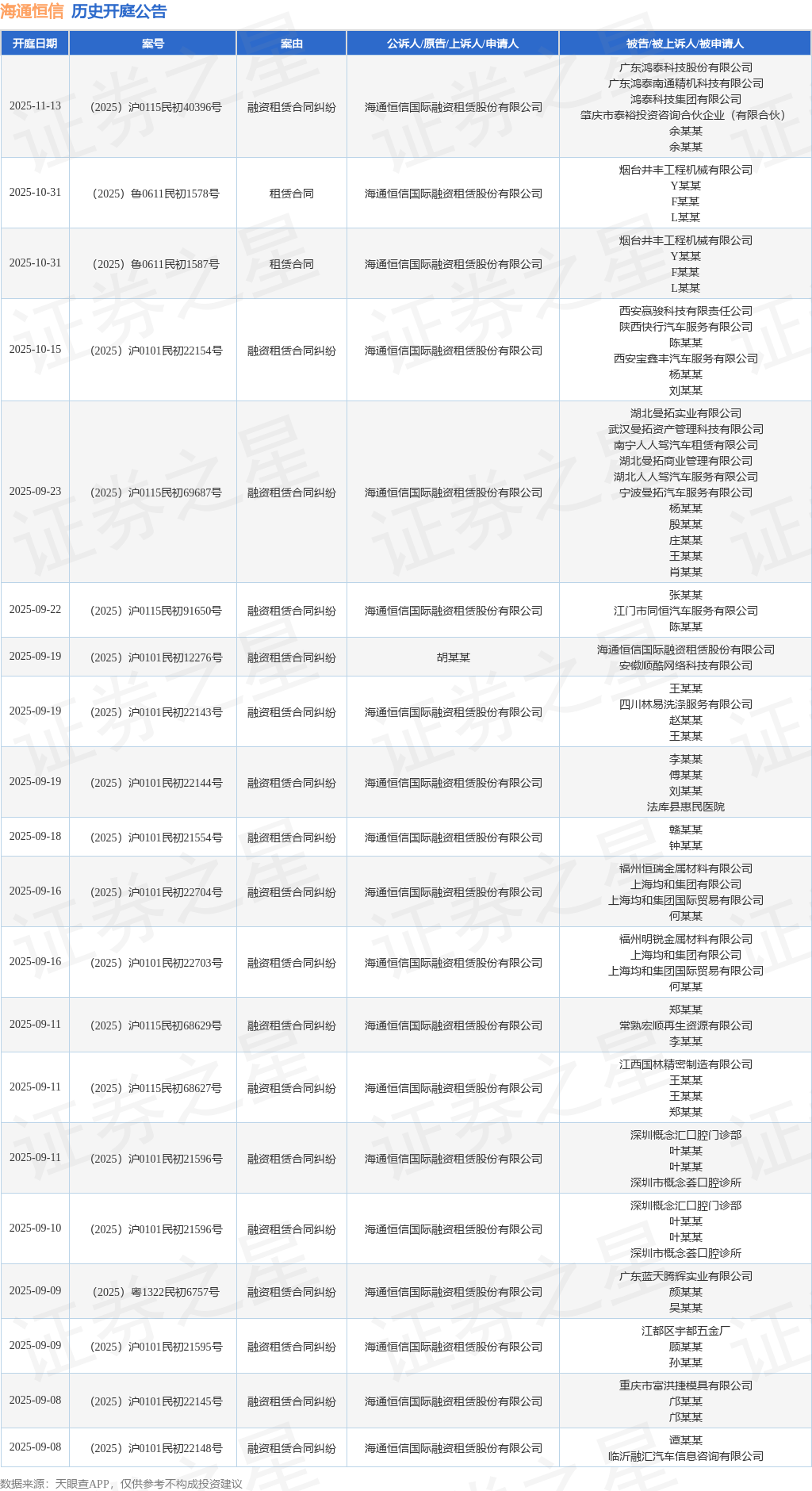 证券之星消息,根据天眼查APP显示,近日公布了一则海通恒信国际融资租赁股份有限公司作为被告/被上诉人的开庭公告,详细内容如下: