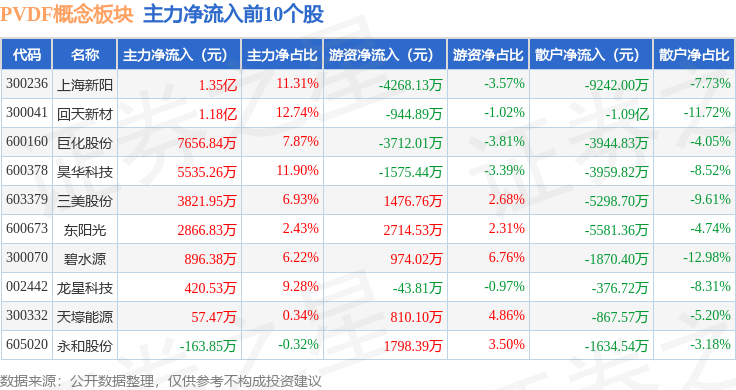 从资金流向上来看,当日PVDF概念板块主力资金净流入2.92亿元,游资资金净流入2919.8万元,散户资金净流出3.21亿元。PVDF概念板块个股资金流向见下表:
