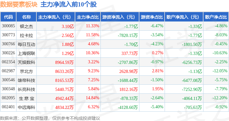 从资金流向上来看,当日数据要素板块主力资金净流出15.31亿元,游资资金净流出1.76亿元,散户资金净流入17.07亿元。数据要素板块个股资金流向见下表: